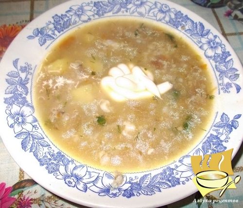 В бульон с картофелем и рисом высыпаем тушеную кислую капусту и мясо (или если хотите, мясо можно засыпать в тарелку порционно). Добавляем зелень, доливаем воды, если требуется, солим и перчим по желанию.