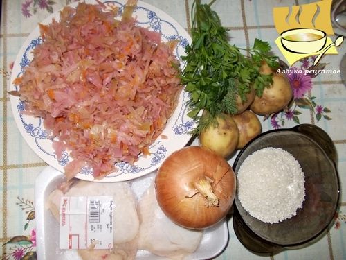 Ингредиенты на 5 л: курятина (или любое другое мясо по вашему вкусу) - 400 г, кислая капуста - 1 кг, лук - 1 шт большая, картофель - 3-5 шт, рис - 1 стакан, зелень, растительное масло для жарки, соль, перец по вкусу.