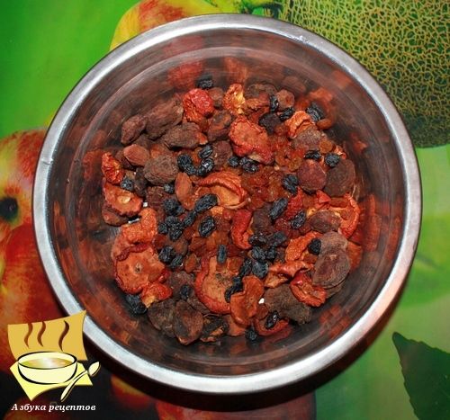 Ингредиенты: сухофрукты (сушеные яблоки, абрикосы, груши, сливы, вишни, чернослив, изюм и т.д.) – 500 г, вода - 7 л, сахар –1,5 стакана (получится сладким).