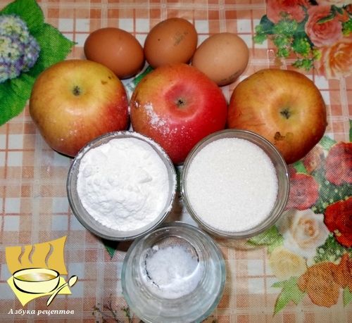 Ингредиенты: мука - 1 стакан, сахар - 1 стакан, яйца - 3 шт, яблоки средние - 3 шт, сода - 1/2 ч. ложки.