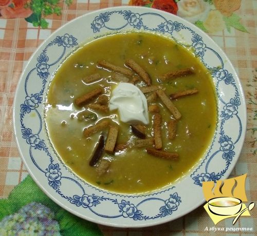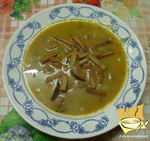 Ингредиенты: горох - 500 г, голяжка свиная - 1 шт (400-500 г), лук - 2 шт, морковь - 2 шт, картофель - 4-5 шт, соль по вкусу, сухарики или гренки.