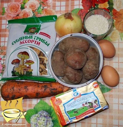 Ингредиенты: сухие грибы - 50 г, картошка - 3-6 шт, морковь - 1 шт, лук - 1 шт, рис - 1/2 стакана, яйца - 2 шт, сливочное масло - 20 г, зелень по желанию.