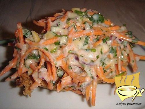 Добавляем в салат корейскую морковь, майонез, тщательно перемешиваем и украшаем мелконарезанными перышками зеленого лука. Сверху салат можно чуть присыпать тертым сыром.