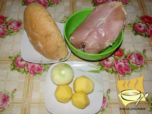 Ингредиенты: куриная грудка - 1 шт, четверть хлеба, картофель - 3 шт, луковица - 1 шт, соль, перец по вкусу.