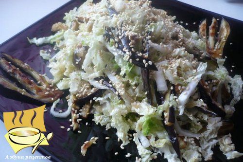 Ингредиенты: баклажаны - 3 шт, китайская капуста - 1 кочан, соевый соус, лимонный сок, кунжутные семечки, соль по вкусу.