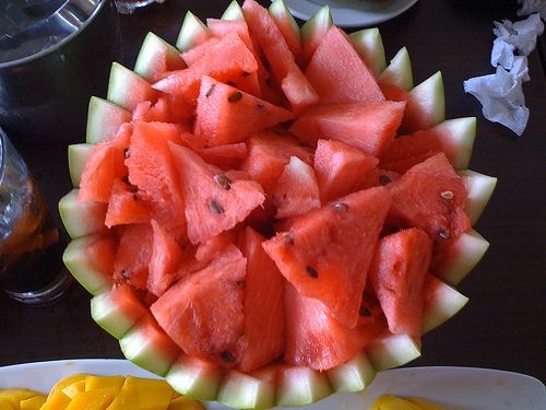 Заслуживает внимания и светлое пятно на стороне арбуза, на которой он лежал. Оно должно быть относительно небольшим и ярко-желтым или оранжевым. Полосы на арбузной корочке должны быть яркими и очень контрастными, но при этом без фиолетового оттенка (признака большого количества нитратов).