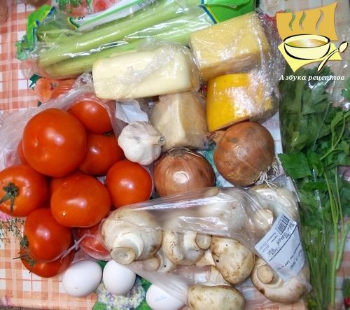 Ингредиенты: сыр моцарелла - 600 г, сыр литовский - 400 г, сыр сливочный - 300 г, сыр маасдам - 300 г, грибы - 300 г, помидоры - 1 кг, лук - 2 шт, сельдерей - 2 стебля, чеснок - 5 зубчиков, петрушка, листы для лазаньи - 12-15 шт, черный перец и соль по вкусу, херес - 100 мл, томатная паста - 2 ст. ложки, яйца - 3 шт.