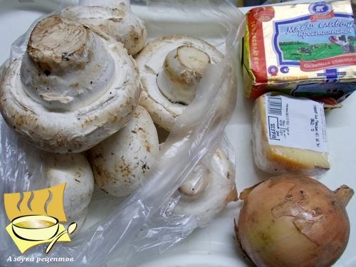 Ингредиенты: шампиньоны - 1 кг, лук - 1 шт, сыр - 100-150 г, сливочное масло - 100 г, соль.
