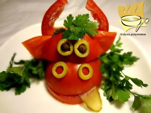 Для создания такой веселой буренки из обыкновенного помидора вам понадобится, собственно, сам помидор, свежий или маринованный огурец, 2 зеленых оливки, душистый перец, зелень и несколько зубочисток.