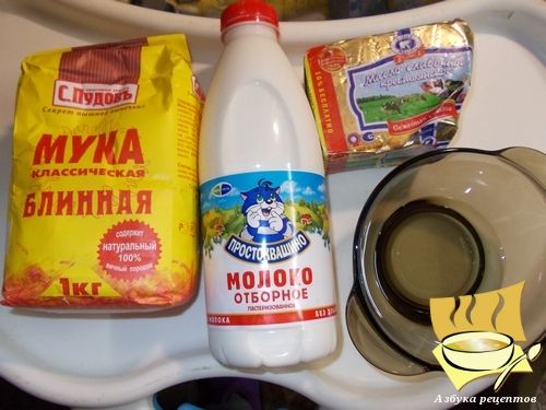 Ингредиенты: молоко жирное - 1 л, мука блинная - 300-500 г (сколько возьмёт тесто), растительное масло - 3 ст. ложки в тесто + для жарки, сливочное масло - 100 г.