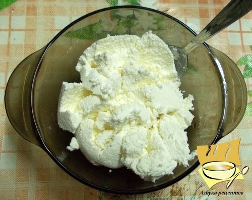 Когда сыворотка начнет отделятся, сливаем творог.