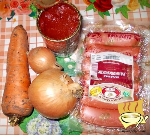 Ингредиенты: пачка сарделек (примерно 600-700 г), одна большая морковь, пара луковиц, столовая ложка муки, две столовые ложки томатной пасты, соль и специи по вкусу, растительное масло для жарки.