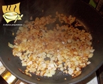В кастрюлю объемом 4 л наливаем примерно 2-2,5 литра воды, высыпаем обжаренный лук. Доводим до кипения и варим на медленном огне.