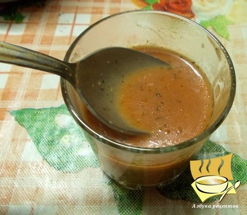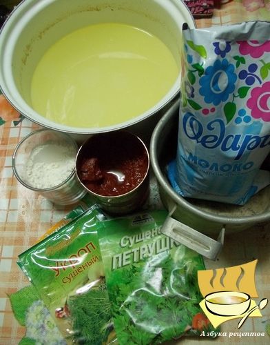 Ингредиенты: бульон мясной - 400 мл, молоко или сливки - 100 мл, томатная паста - 2 ст. ложки, мука - 2-3 ст. ложки, масло сливочное - 50 г, зелень сухая разная и соль по вкусу.