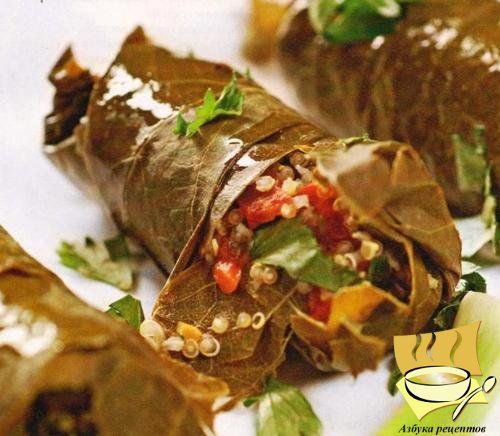 P. S. В связи с наличием отсутствия булгура, я заменяю его пшеничной крупой. Если есть свежие виноградные листья, я предпочитаю использовать их. Для большей гибкости их надо обдать кипятком.