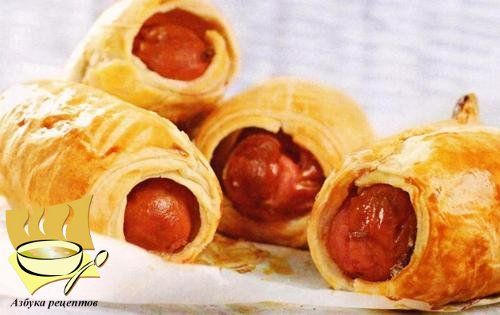 Как приготовить сардельки в тесте: На присыпанной мукой поверхности раскатать тесто в максимально большой прямоугольник. Равномерно присыпать его тертым сыром, сложить пополам и руками прижать края. Еще раз раскатать тесто, смазать его горчицей и разделить на 12 равных частей. Положить на край каждой части сардельку и свернуть рулетом.