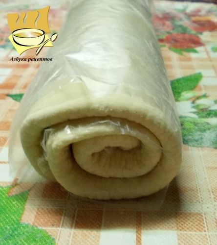 Кладем тесто большой стороной к себе, сворачиваем тесто так, чтобы слои накладывались друг на друга - левую половину подворачиваем во внутрь и накрываем правой. Убираем в холодильник на 15-20 минут.
