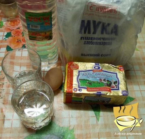 Ингредиенты: мука - около 3 стаканов + 75 г, яйцо - 1 шт, сливочное масло - 200 г, уксус 9 % - 3 ч. ложки, соль - 1/4 ч. ложки, акоголь не менее 40 градусов - 1 ст. ложка, вода.