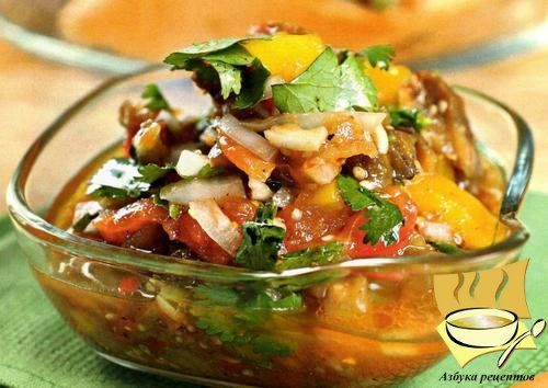 Ингредиенты: большие баклажаны - 2 шт, большие помидоры - 2 шт, красный сладкий перец - 1 шт, красный острый перчик - 1 шт, большая луковица - 1 шт, чеснок - 4 зубчика, кинза - 1 пучок, растительное масло - 100 мл, соль, перец.