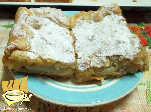 Готовый пирог достаем из духовки, остужаем, делим на порции, посыпаем пудрой.