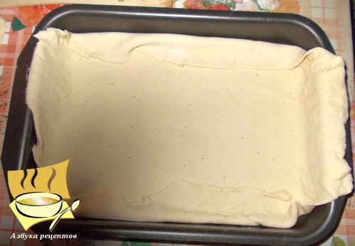Перекладываем раскатанный пласт в форму, делаем отверстия для прохождения воздуха. Удаляем лишнее тесто с боков.