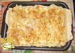 Чистим яблоки от шкурки и середок, режем на тонкие полоски. Выкладываем слой яблок на тесто, посыпаем сахаром и корицей.