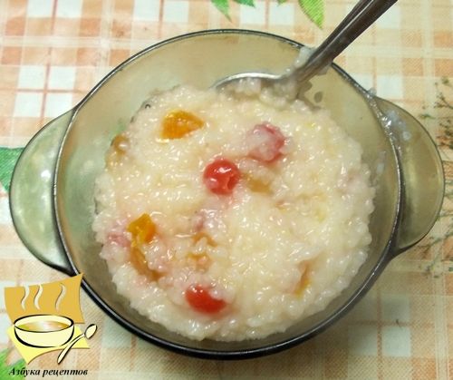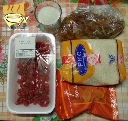 Ингредиенты: рис - 2 стакана, изюм - 200 г, курага - 150 г, вишня без косточки - 50-70 г, сливочное масло, сахар, соль по вкусу, вода по необходимости.