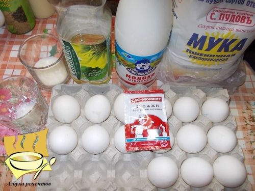 Ингредиенты: мука - 7 стаканов; яйца - 8 шт; молоко - 1,5 стакана; растительное масло - 10 ст. ложек; сахар - 1 ст. ложка; дрожжи - 1 пакетик, соль - 1/2 ч. ложки.