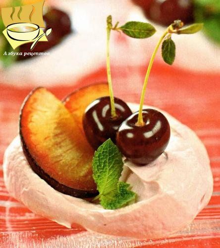 Ингредиенты: яичный белок - 3 шт, сахар - 150 г, гранатовый сироп - 2 ст. л. Для украшения: сливы - 3 шт, вишни - 20 шт, мята - 2-3 веточки.