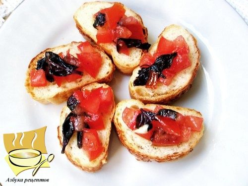 Помидорно-базиликовую массу выкладываем на пропитанные чесноком хлебные кусочки – брускетта готова!