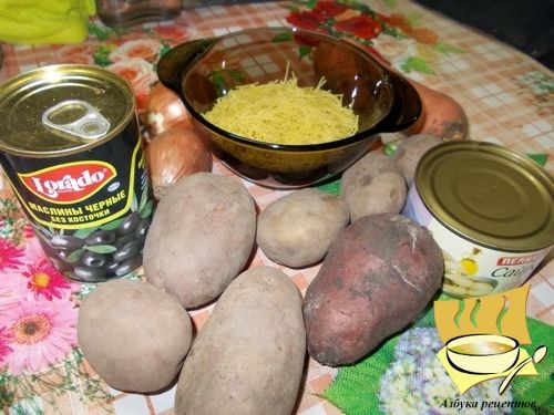 Ингредиенты: консерва рыбная - 1 банка, картофель - 5-6 шт, лук - 2-4 шт, морковь - 1 шт, вермишель мелкая - 50 г, маслины без косточки - 1 банка, соль и зелень по вкусу.