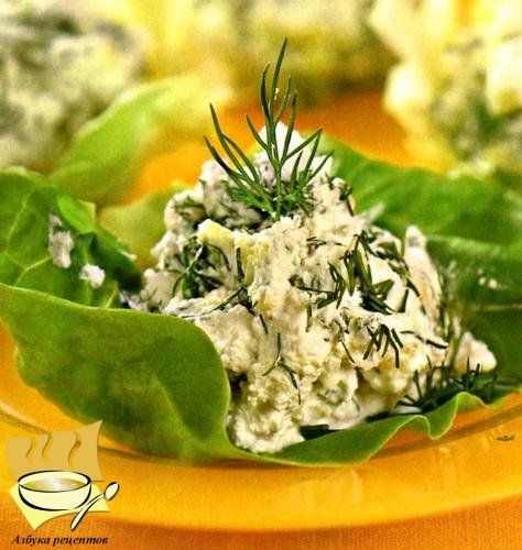 Ингредиенты: творог - 250 г, натуральный йогурт - 200 г, огурцы - 2 шт, чеснок - 2 зубчика, укроп - 1 пучок, соль, перец - по вкусу. Для подачи: салатные листья.