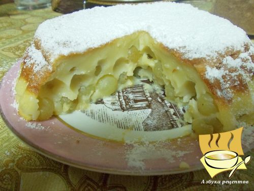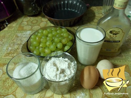 Ингредиенты: виноград без косточки - 300 г, молоко - 1 стакан, сахар - 50-100 г, мука - 70-100 г, яйца - 2 шт, коньяк - 1 ст. ложка, сахарная пудра для посыпки.