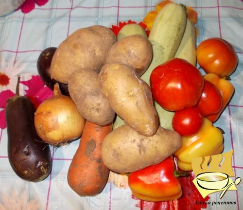Ингредиенты: На большую 5-литровую кастрюлю: картофель - 5 шт, кабачки - 3 шт, баклажаны - 1-2 шт, морковь - 1 шт, перец болгарский - 3-5 шт, помидоры - 5 шт, лук 1-2 шт, растительное масло для жарки, соль и перец по вкусу.