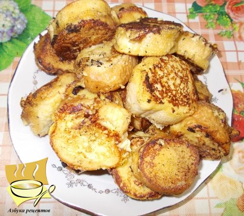 Если батон очень черствый, то кусочки надо замочить в молочной смеси немного раньше, если нормальный, то каждый кусочек обмакиваем в молочно-яйчной смеси.
