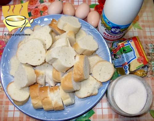 Ингредиенты: батон или багет - 2 шт, молоко - 500 мл, яйца - 4 шт, сахар - 3 ст. ложки, сливочное масло для жарки - 50-100 г, соль по желанию.
