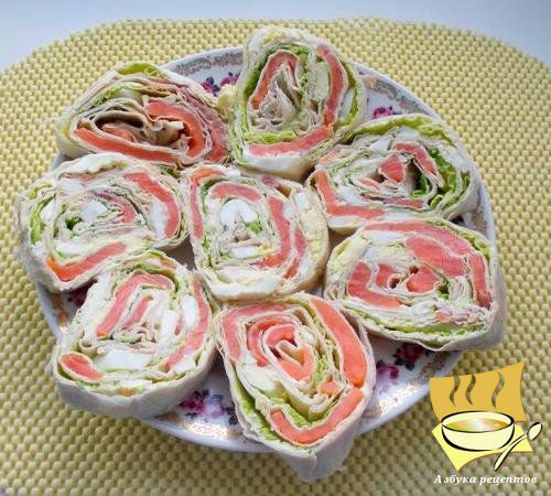 Пласт лаваша с рыбой кладем на пласт с салатом и яйцами.