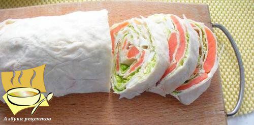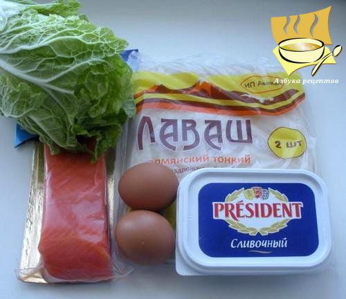 Ингредиенты: семга соленая – 1 кусочек (200-300 г), яйцо вареное – 2 шт, салат китайский или пекинская капуста – несколько листочков, сыр плавленый – 20 г, лаваш армянский – 1 пластина, пищевая пленка – для заворачивания.
