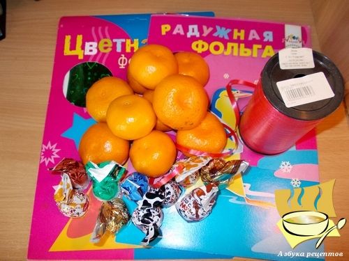 Ингредиенты: мандарины - 10 шт, конфеты - 10 шт, фольга - 1 уп, упаковочная лента - 1 шт, степлер.