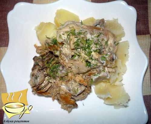 Подавать блюдо можно с отварным картофелем или же картофельным пюре. Также прекрасным гарниром к тушеной с грибами и сметаной курице может послужить отварной рис.