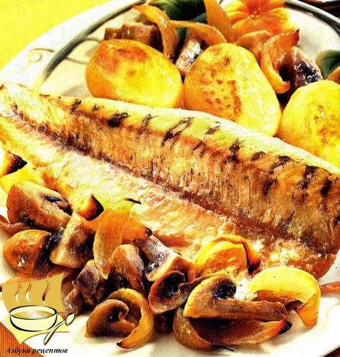 Ингредиенты: судак - 1 шт. (около 1,2 кг), сливочное масло - 2 ст. л, сметана - 3/4 стакана, шампиньоны - 400 г, луковицы - 2 шт, паприка - 1 ч. л, мука - 1/2 ст. л, соль по вкусу.