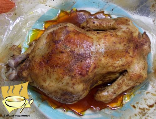 Запаковываем курицу в пакет или пленку для запекания. Разогреваем духовку до 200 С и ставим нашу курочку, если хотите чтобы она совсем разваливалась на 1,5-2 часа, если была поплотней, то на меньшее время.