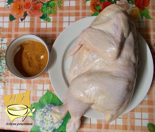 Ингредиенты: курица - 1 шт, по 1/2 ч ложке - карри не острое, хмели-сунели, черный перец, красный острый перец; растительное масло - 2 ст. ложки, соль.