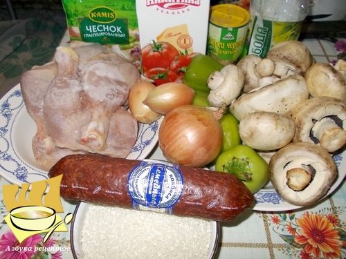 Ингредиенты: курятина - 1 кг, шампиньоны - 400 г, сладкий перец - 3 шт, лук - 2 шт, сырокопченая колбаса - 150-200 г, рис - 400 г, томатный сок - 1 л, сушеный чеснок - 1 ч. л (свежий 5 зубчиков), сушеный острый красный перец - 1 ч. л (или 1 свежий красный перец), соль, черный перец по вкусу, растительное масло для жарки.