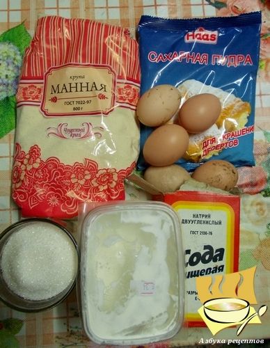 Ингредиенты: манка - 1 стакан, сметана - 1 стакан, сахар - 1 стакан, яйца - 3 шт, сода - 1/2 ч. ложки, соль щепотка.