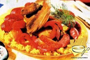 Ингредиенты: цыплята - 2 тушки, помидоры - 2 шт, сладкий красный перец - 4 шт, свиная колбаса - 450 г, рис - 1,5 стакана, луковица - 1 шт, свиной жир - 3 ст. л, красный молотый перец - 1 ст. л, черный перец - 2 горошины, соль - 1,5 ч. л.