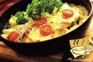 Натереть на терке сыр и вмешать его в сметану, добавить соль и перец. Вылить смесь в сковороду, украсить помидорчиками черри. Поставить в разогретую духовку на 30-40 мин. до готовности.