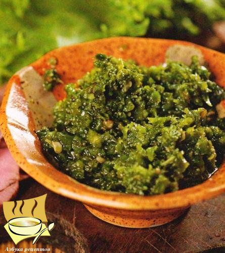 Ингредиенты: острый зеленый перец - 1 кг, большая головка чеснока - 1 шт, пучок кинзы - 1 шт, семена кориандра - 1/2 ч. л, большая горсть соли.